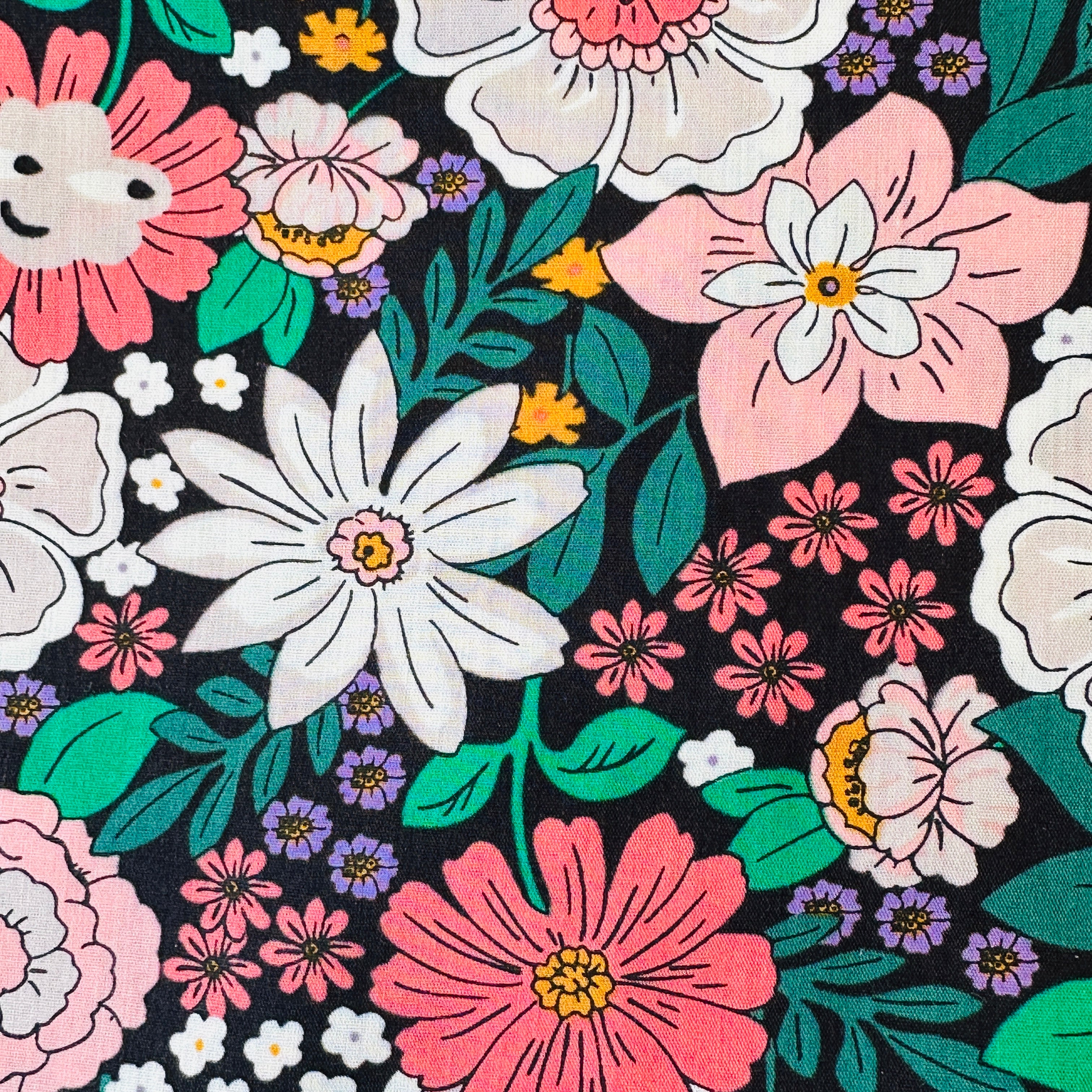 140cms Wide by The Metre Adorable BLACK Floral All Cotton Fabric