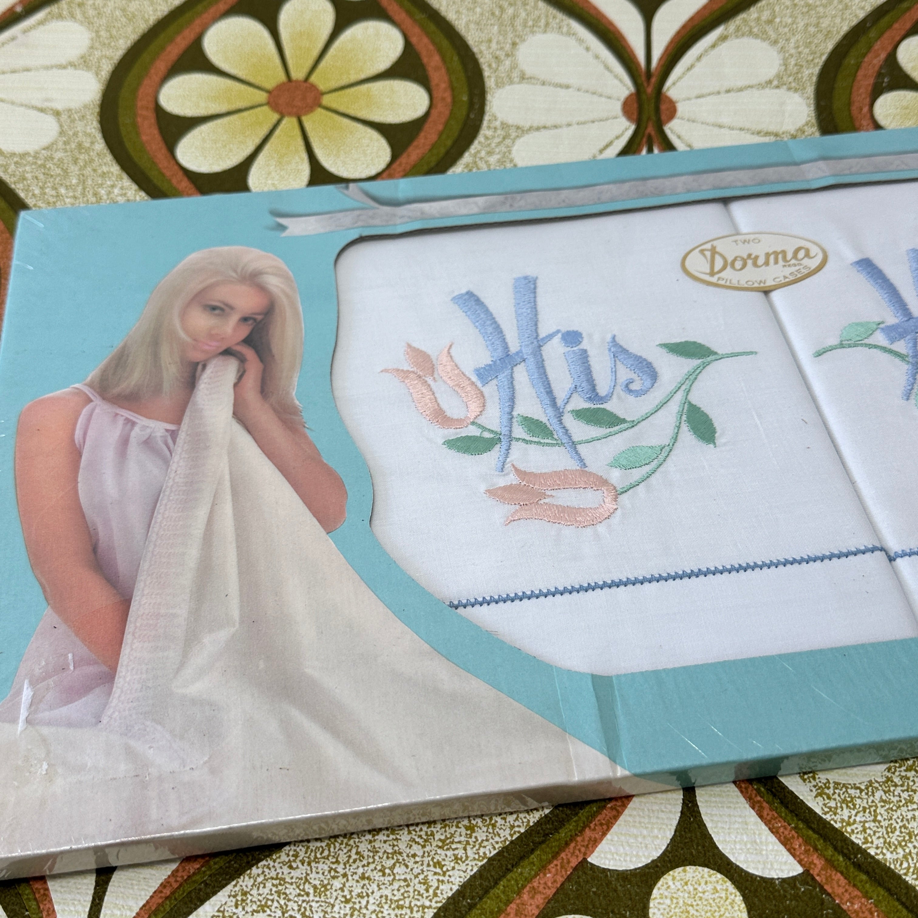BOXED Retro Vintage Cotton His Her Pillow Cases DORMA